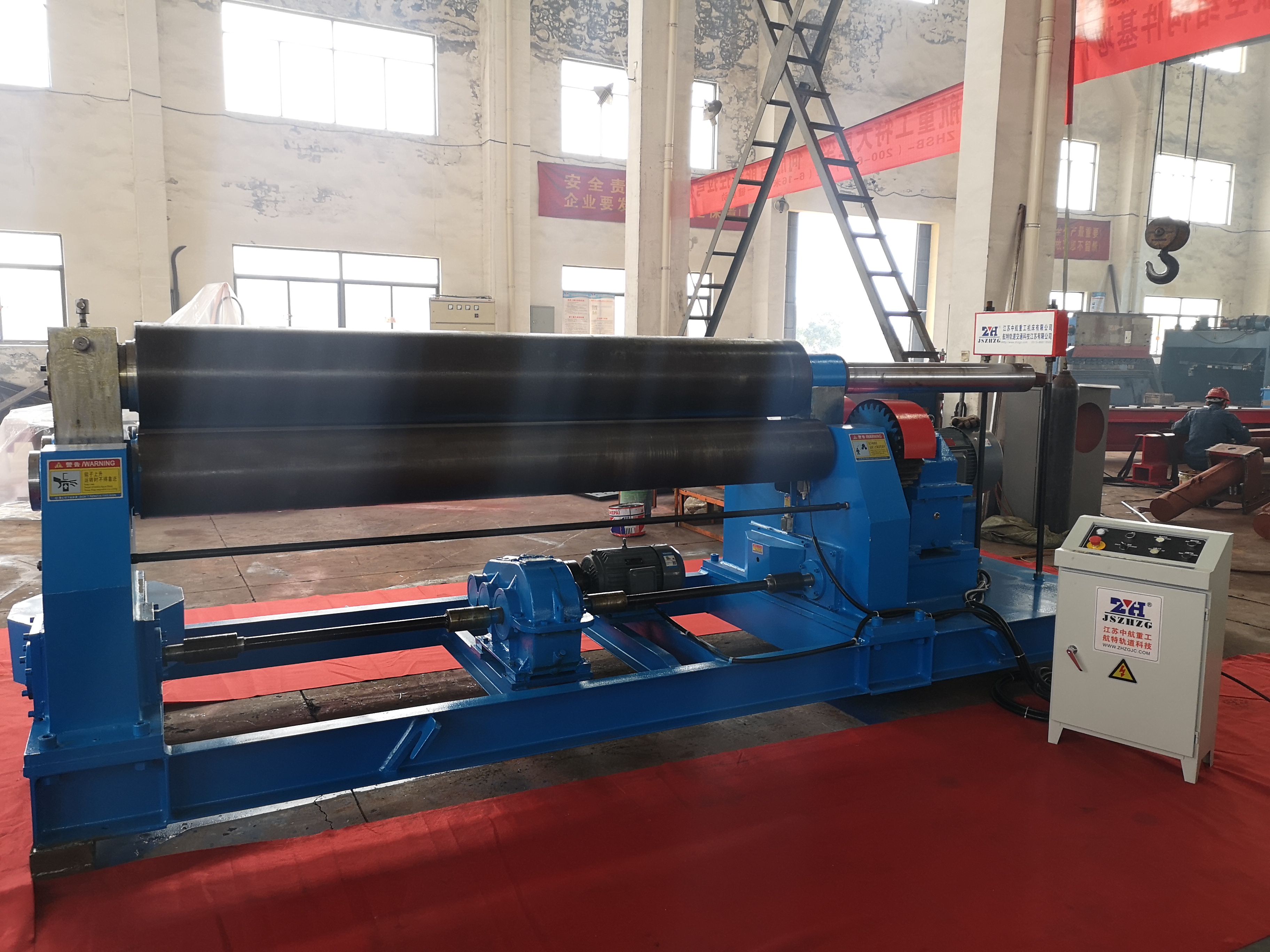 該機適合用于金屬板材的彎曲變形,可卷制圓形、弧形和一定范圍內的錐形工件,有板材端部預彎功能,本機型兩個下輥為主動輥可水平移動,上輥為從動輥可上下移動,傳動軸均采用萬向連軸器連接。 三輥卷板機有機械式和液壓式:機械式三輥卷板機分為對稱和非對稱。