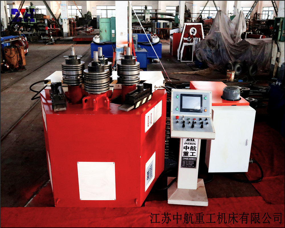 型材彎曲機工作原理:型材彎曲機為直線下調式型材卷彎機,機器的兩個邊輥為主傳動輥,也可以三個工作輥為主傳動輥,上輥位置固定,下輥向上夾緊工件防止截面變形,兩個邊輥對應上輥做直線升降運動,液壓控制,位移數字顯示,有利于控制型材成形過程,兩側有數控托輥及扭曲糾正裝置,有利于保證非對稱截面型材的卷制質量及成型雙曲面工件。